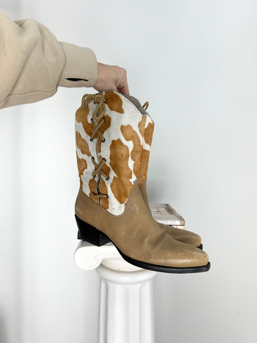 VINTAGE COW PRINT TAN LEATHER COWBOY BOOTS | 7